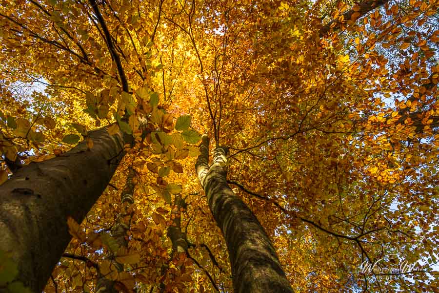 Maar omhoog kijken was ook wel de moeite waard. Langs een fietspad, waar ik af en toe weg moest springen voor voorbij razende wielrenners, viel het licht mooi door de gele, doorschijnende beukenbladeren.